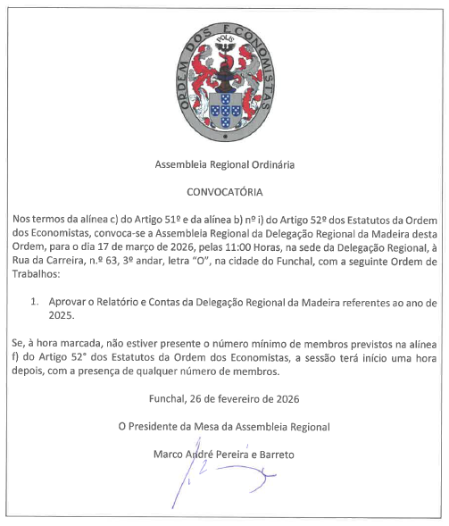 Vai realizar-se a Assembleia Regional da Delegação Regional da Madeira da Ordem dos Economistas no próximo dia 17 de março de 2026, pelas 11h00, presencialmente na sede da Delegação Regional da Ordem dos Economistas, à Rua da Carreira, 63 - 3º O, 9000-042 Funchal.
