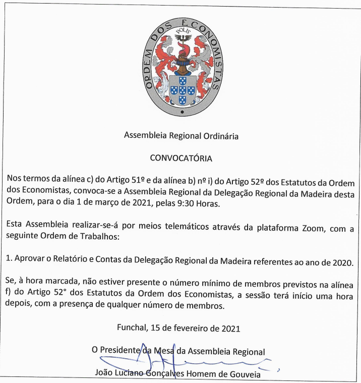 Face à atual situação social em que nos encontramos devido à Pandemia COVID-19 a Assembleia Regional Ordinária da Delegação Regional da Madeira da Ordem dos Economistas vai-se realizar no próximo dia 1 de Março, pelas 9h30, através da Plataforma ZOOM.